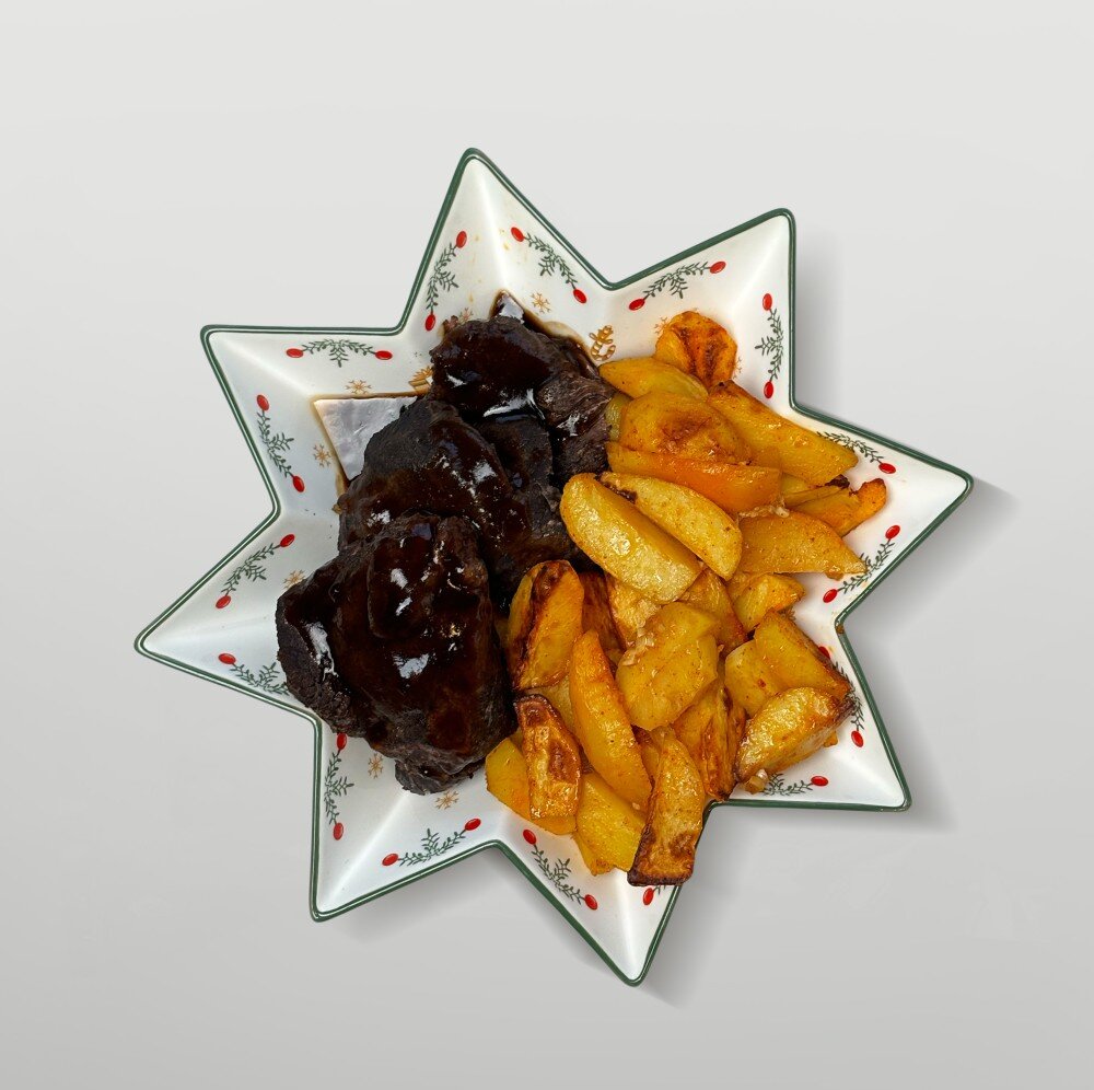 Щечки говяжьи отварные, соус демигас (вода, соус унаги, сахар), морковь свежая, сельдерей свежий, винокравное сухое, розмарин, тимьян, базилик сухой, приправа смесь пяти перцев, соль, сахар.